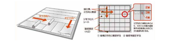 GH(ジオハイブリッド)工法は、深部へのグラウト注入による地盤改良と、砕石層にジオテキスタイルを敷設する表層補強を組み合わせた小規模建築物向けの地盤補強工法です。